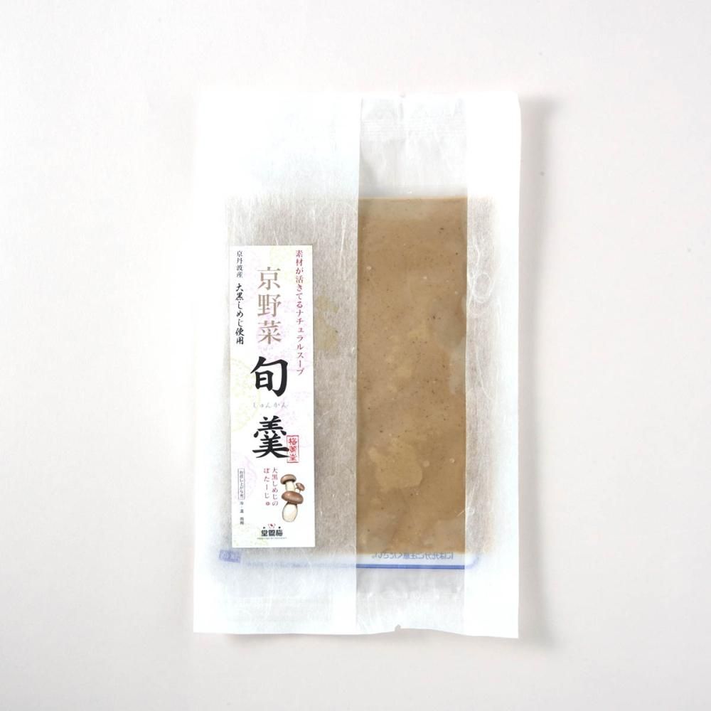 『香り松茸、味しめじ』といわれるシメジとは、この本シメジのこと。ふっくらとした大黒しめじには3 大旨味成分のグアニル酸がたっぷり(椎茸の3 倍)含まれているため、味の深さは折り紙付きです(オルニチンは蜆の6 倍。肝臓を気にする方にお勧め)。贅沢に生クリームを20%以上加えて、滑らかに仕上げました。 ※写真は調理例です。お好みのお野菜をご用意ください。 【「旬羹」の特徴】 1 素材を厳選 それぞれのスープのフレーバーを決める野菜は京都産の路地物を中心にチョイス。 できるだけ産地に足を運び、土と生産者のめぐみを感じられる素材を選びました。 2 通も納得する本物の味 食にこだわる消費者のために添加物や香料に頼らず、素材本来の味を濃厚に味わえるスープにしました。 原価は上がってしまいますが、一般的には常識はずれなほど、原材料をふんだんに使っています。 職人による、レストランレベルの丁寧なつくり方にこだわりました。 3 和と洋の絶妙なバランス感で幅広く 和風素材をスタイリッシュにアレンジしています。味噌などは一歩間違えると味噌汁になってしまいますから。京都の和の感覚を活かしながら、ディナーの主役になれる、おしゃれなスープになっています。 4 簡単調理 電子レンジで約3 分、湯せんで約3 分半温め、器に盛りつけるだけ。電子レンジ対応包装です。 一部の商品は冷蔵解凍にて、冷製スープとしても楽しめます。
