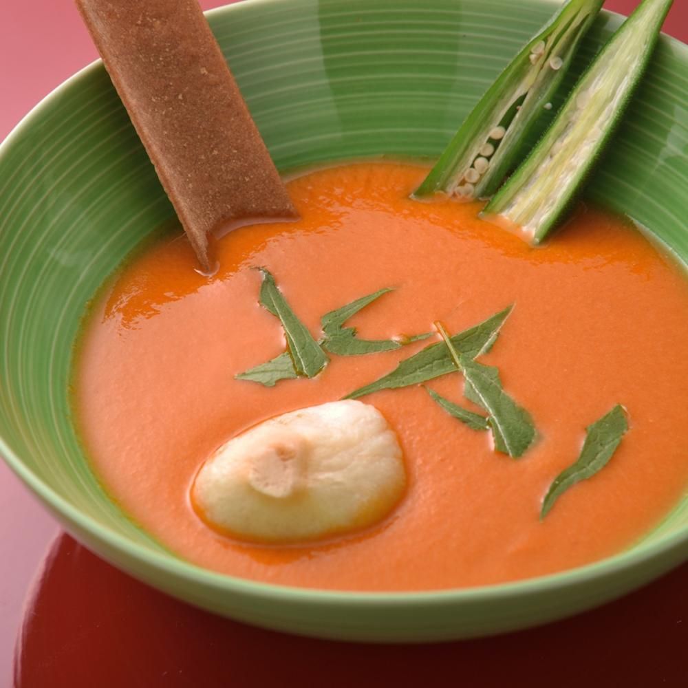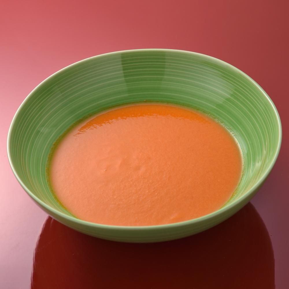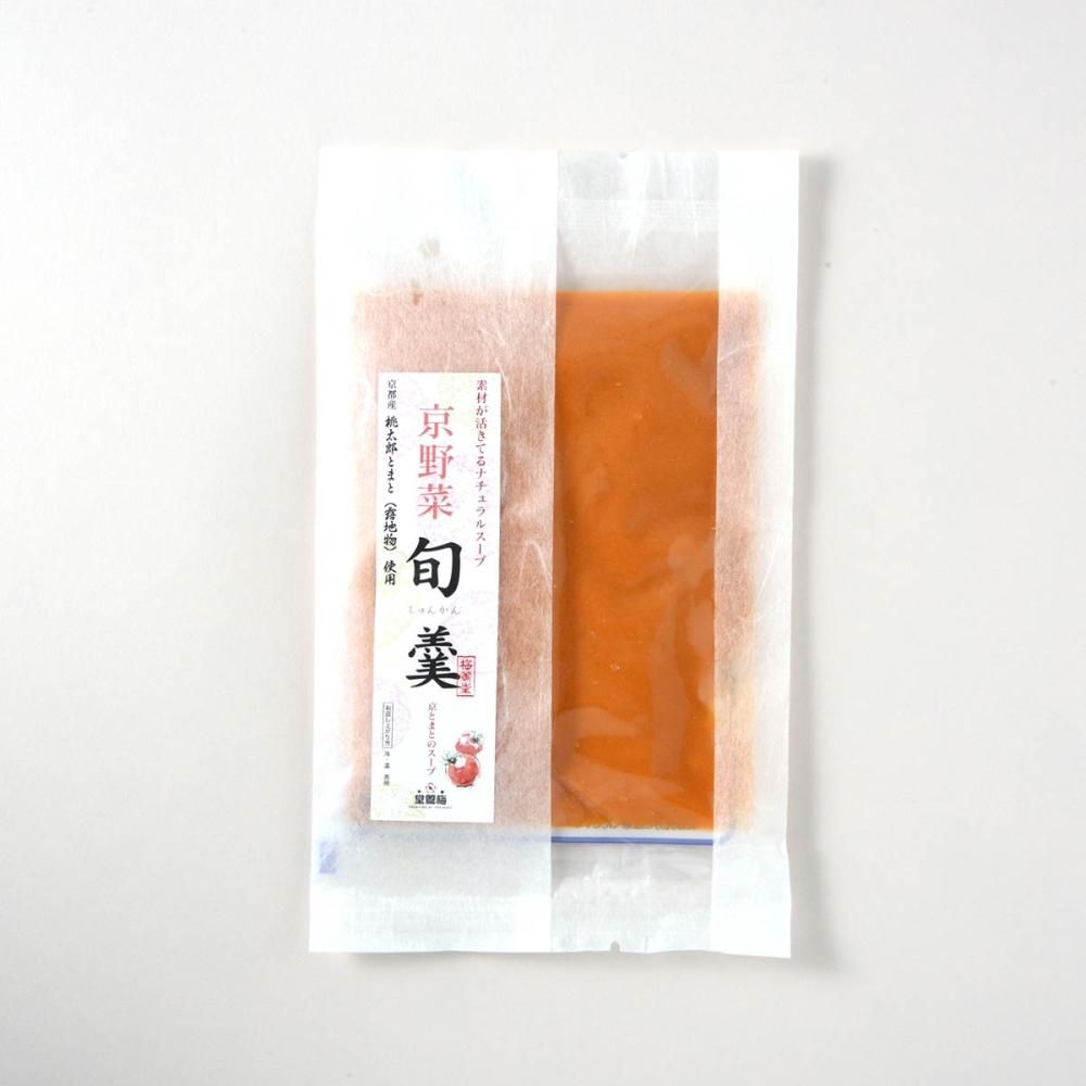 濃縮トマトを使わず、路地物の生トマトをじっくり煮詰めて作りました。 トマトの味を邪魔しないよう、雑味のない京赤地どりのブイヨンをベースに、隠し味に塩?と昆布で和風のテイストを加味。とても上品な味わいのトマトスープです。 ※写真は調理例です。お好みのお野菜をご用意ください。 【「旬羹」の特徴】 1 素材を厳選 それぞれのスープのフレーバーを決める野菜は京都産の路地物を中心にチョイス。 できるだけ産地に足を運び、土と生産者のめぐみを感じられる素材を選びました。 2 通も納得する本物の味 食にこだわる消費者のために添加物や香料に頼らず、素材本来の味を濃厚に味わえるスープにしました。 原価は上がってしまいますが、一般的には常識はずれなほど、原材料をふんだんに使っています。 職人による、レストランレベルの丁寧なつくり方にこだわりました。 3 和と洋の絶妙なバランス感で幅広く 和風素材をスタイリッシュにアレンジしています。味噌などは一歩間違えると味噌汁になってしまいますから。京都の和の感覚を活かしながら、ディナーの主役になれる、おしゃれなスープになっています。 4 簡単調理 電子レンジで約3 分、湯せんで約3 分半温め、器に盛りつけるだけ。電子レンジ対応包装です。 一部の商品は冷蔵解凍にて、冷製スープとしても楽しめます。