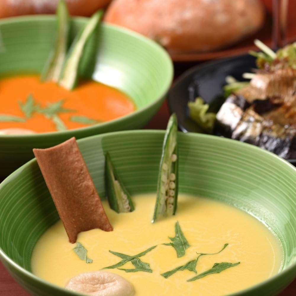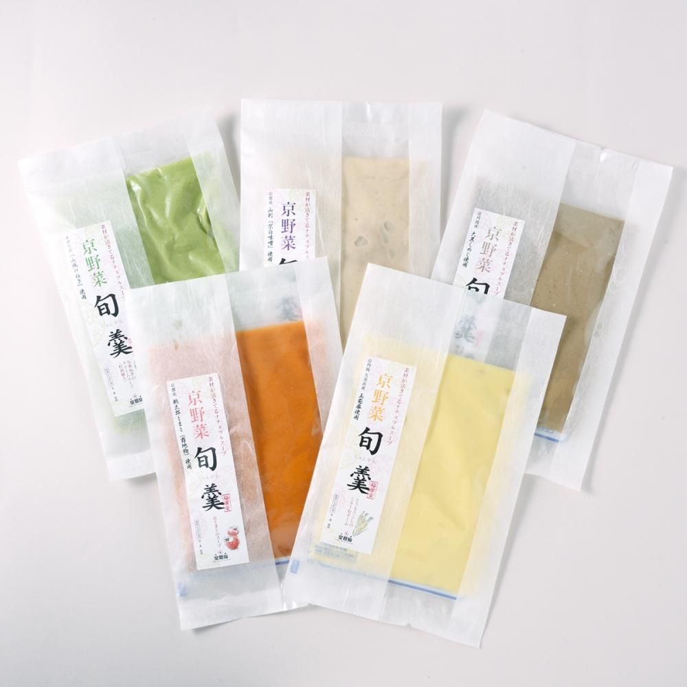 【「旬羹」5食セットセット内容】 ■玉蜀黍のくりーむすーぷ ブイヨンを使わずに、ほとんどトウモロコシと乳製品のみで作る挑戦的な作品。スープとして最も一般的な材料のトウモロコシだけに、旬羹の品質の高さと方向性がはっきりと感じられる逸品です。素材の味のみでストーレートに勝負する、甘さ!香ばしい香り!スッキリした余韻! ■京とまとのスープ 濃縮トマトを使わず、路地物の生トマトをじっくり煮詰めて作りました。 トマトの味を邪魔しないよう、雑味のない京赤地どりのブイヨンをベースに、隠し味に塩?と昆布で和風のテイストを加味。とても上品な味わいのトマトスープです。 ■大黒しめじのぽたーじゅ 『香り松茸、味しめじ』といわれるシメジとは、この本シメジのこと。ふっくらとした大黒しめじには3 大旨味成分のグアニル酸がたっぷり(椎茸の3 倍)含まれているため、味の深さは折り紙付きです(オルニチンは蜆の6 倍。肝臓を気にする方にお勧め)。贅沢に生クリームを20%以上加えて、滑らかに仕上げました。 ■西京味噌と京赤地どりのスープ 鶏肉流通量のわずか1%の地鶏。中でも両親ともに赤鶏の希少肉を使用しています。京赤地どりの手羽元よりブイヨンをとり、混合だし(鯖、うるめ、宗田鰹など)を加えたベースに、名店「山利」の西京味噌で味付け。米?の優しい甘さに包まれます。味のバランスをとるのに最も苦心した作品です。ほろりとした地鶏肉団子入り。 ■九条ねぎのクリームスープ 九条ネギの魅力、、、色、香り、甘味、爽やかさの、全てを活かした傑作スープ。京赤地どりのブイヨンをベースに、さっとゆでてピューレにした九条ネギをたっぷり加えました。ねぎの香味を損なわないために、ジャガイモでとろみをつけたポタージュ仕立て。爽やかさを演出するサワークリームで仕上げています。食事中のアクセントに粒白コショウ入り。驚くほど上品なスープになりました。 【「旬羹」の特徴】 1 素材を厳選 それぞれのスープのフレーバーを決める野菜は京都産の路地物を中心にチョイス。 できるだけ産地に足を運び、土と生産者のめぐみを感じられる素材を選びました。 2 通も納得する本物の味 食にこだわる消費者のために添加物や香料に頼らず、素材本来の味を濃厚に味わえるスープにしました。 原価は上がってしまいますが、一般的には常識はずれなほど、原材料をふんだんに使っています。 職人による、レストランレベルの丁寧なつくり方にこだわりました。 3 和と洋の絶妙なバランス感で幅広く 和風素材をスタイリッシュにアレンジしています。味噌などは一歩間違えると味噌汁になってしまいますから。京都の和の感覚を活かしながら、ディナーの主役になれる、おしゃれなスープになっています。 4 簡単調理 電子レンジで約3 分、湯せんで約3 分半温め、器に盛りつけるだけ。電子レンジ対応包装です。 一部の商品は冷蔵解凍にて、冷製スープとしても楽しめます。
